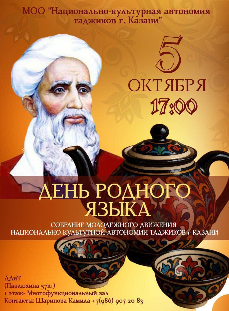 Приглашаем Вас на Ежегодную встречу молодежного движения НКА таджиков г. Казани, посвящённую дню родного языка. Мероприятие состоится 5 октября в 17:00 по адресу: Дом Дружбы народов Татарстана (Павлюхина 57к1), 1 этаж.